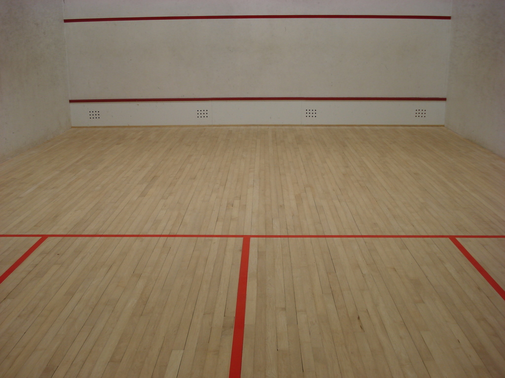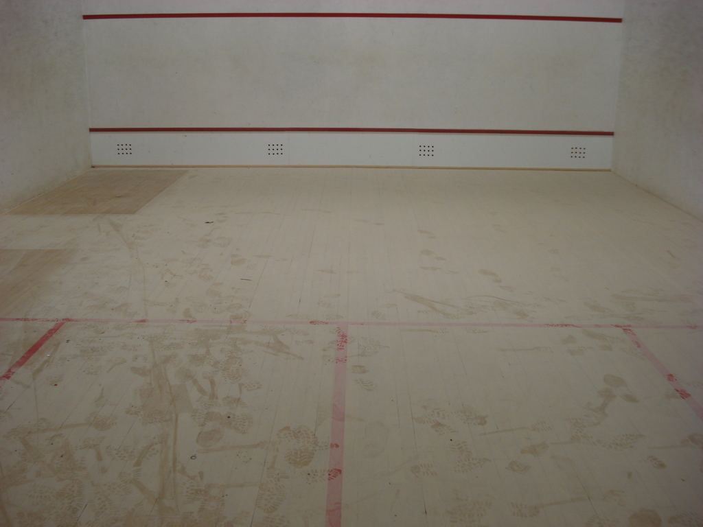 Contract Floor Sanding and Line Marking by Floorcare Services. Squash court refurbishment for Rolls Royce Leisure in Derby, Derbyshire. Squash court sanded back to bare wood, all marks in wood removed and line marked using Hard wearing two pack epoxy court marking paint in Red.