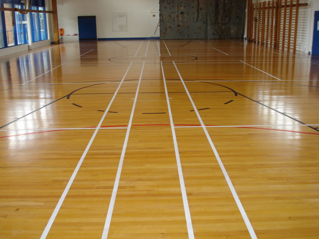Hardwood Sports Hall floor Cleaned, Abraded, Indoor Line / Court marked and Sealed by Floorcare Services. Sports Hall floor Specialists. This Sports Hall Floor Cleaning, Abrading and Re-sealing was completed in Lancaster, Lancashire. School Sports Hall Flooring Refurbishment / Restoration. Indoor Sports Hall line / Court marked with a Basketball court ( Black ), Netball court ( Red ), and 4 badminton courts ( White) using Hard wearing two pack epoxy paint. Sealed with 2 coats of heavy duty Sports Hall floor Seal