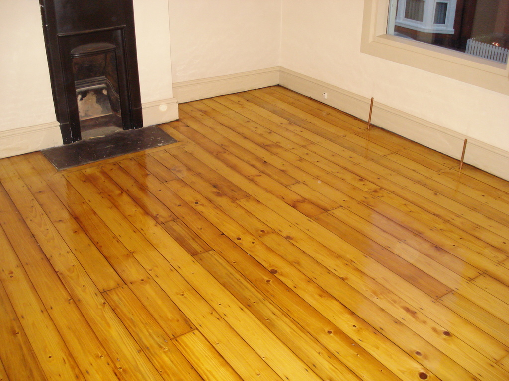 Pine softwood Floor Sanding and Sealing by Floorcare Services. Pine Soft wood floor boards Sanded back to bare wood and Sealed with 3 coats of Satin finish Polyurethane Seal. Wood flooring Sanded and Sealed in Ashbourne, Derbyshire. Floorcare Sanded and sealed the 25 sqm with 2 coats of seal in 1 Day with following day to final coat only. This photo has been taken prior to the final coat being applied.