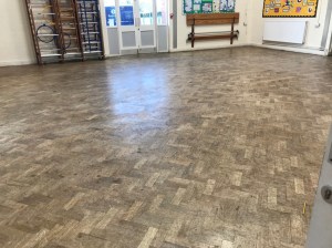118 sqm of Hardwood Herringbone Bock school Floor Sanding & Varnishing by Floorcare Services (Time Lapse video 48). This hardwood block floor was sanded at Frieth, Henley on Thames. It was sanded back to bare wood removing all previous finish, marks, scratches, etc. Then Sealed with 3 coats of ‘Floortech Products’ – ‘Aquaguard’ a water based 2 component ( 2 pack ) polyurethane commercial grade floor seal conforming to EN BS 14904 Slip resistance for indoor sports play Gloss finish. Aquaguard seal is design for areas exposed to extreme wear. This School Hall floor was Sanded and Sealed with 3 coats in just 3 days.