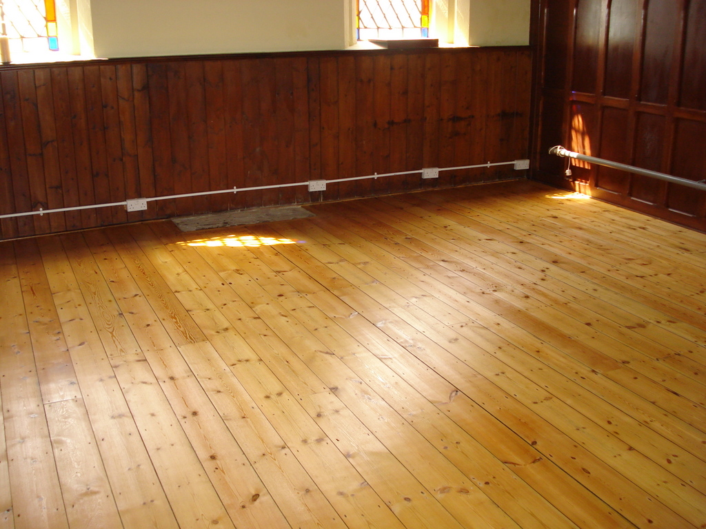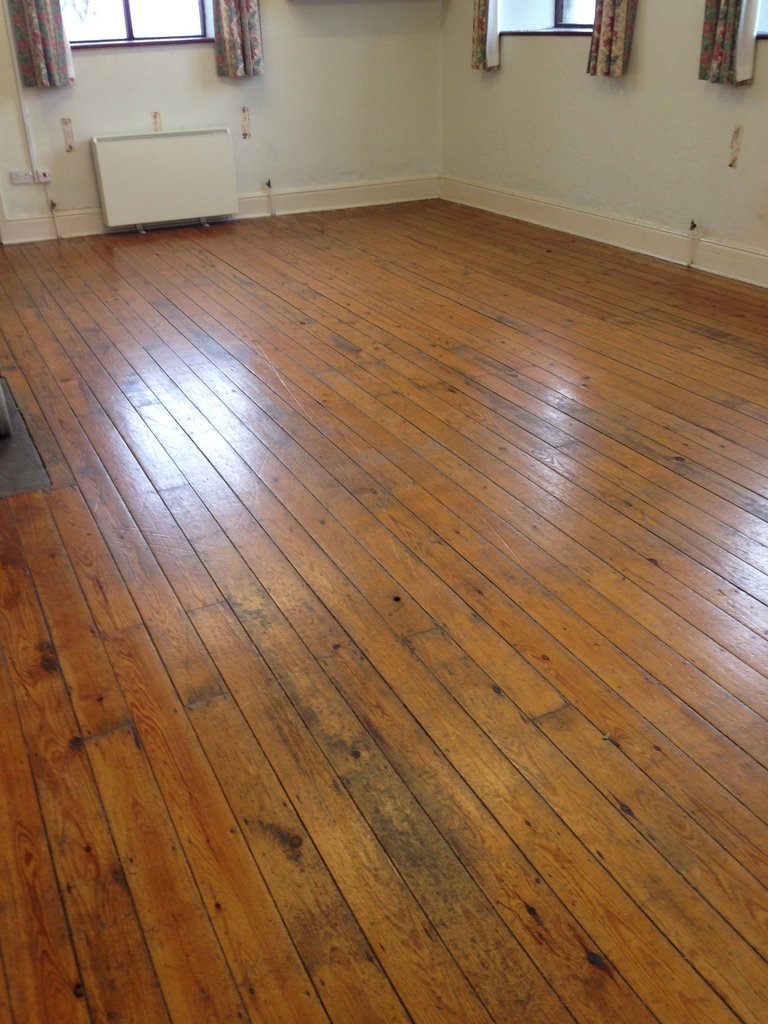 Church Hall Floor Sanding and Sealing by Floorcare Services. Pine Softwood flooring Sanded and Sealed at Shottle Church Hall, Derbyshire. Floorcare Services Sanded this floor back to bare wood and sealed with 3 Coats of hard wearing Polyurethane seal. This floor was restored and damaged areas were filled using wood retained from sanding the floor for smaller repairs. Floorcare Services are wood flooring specialists and completed this job in 1 day with following day to final coat only.