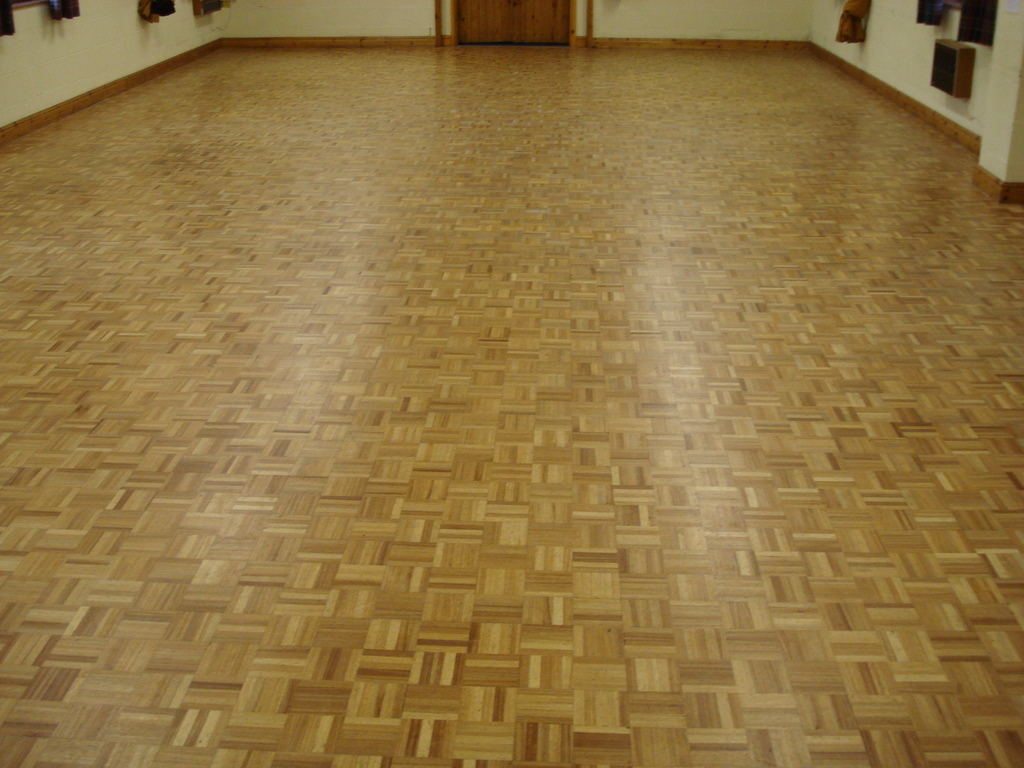 Village Hall Floor Refurbishment by Floorcare Services. Hardwood Mosaics Floor Cleaned, Abraded and Re-sealed at Hognaston Village Hall, Derbyshire. Mosaics Wood Flooring Chemically striped to remove marks and stains and Re-sealed with 2 Coats of Hard Wearing Polyurethane Seal by Floorcare Services. Floorcare Services are Wood Flooring specialists and completed this 98 sqm job in 1 day with following day to final coat only.